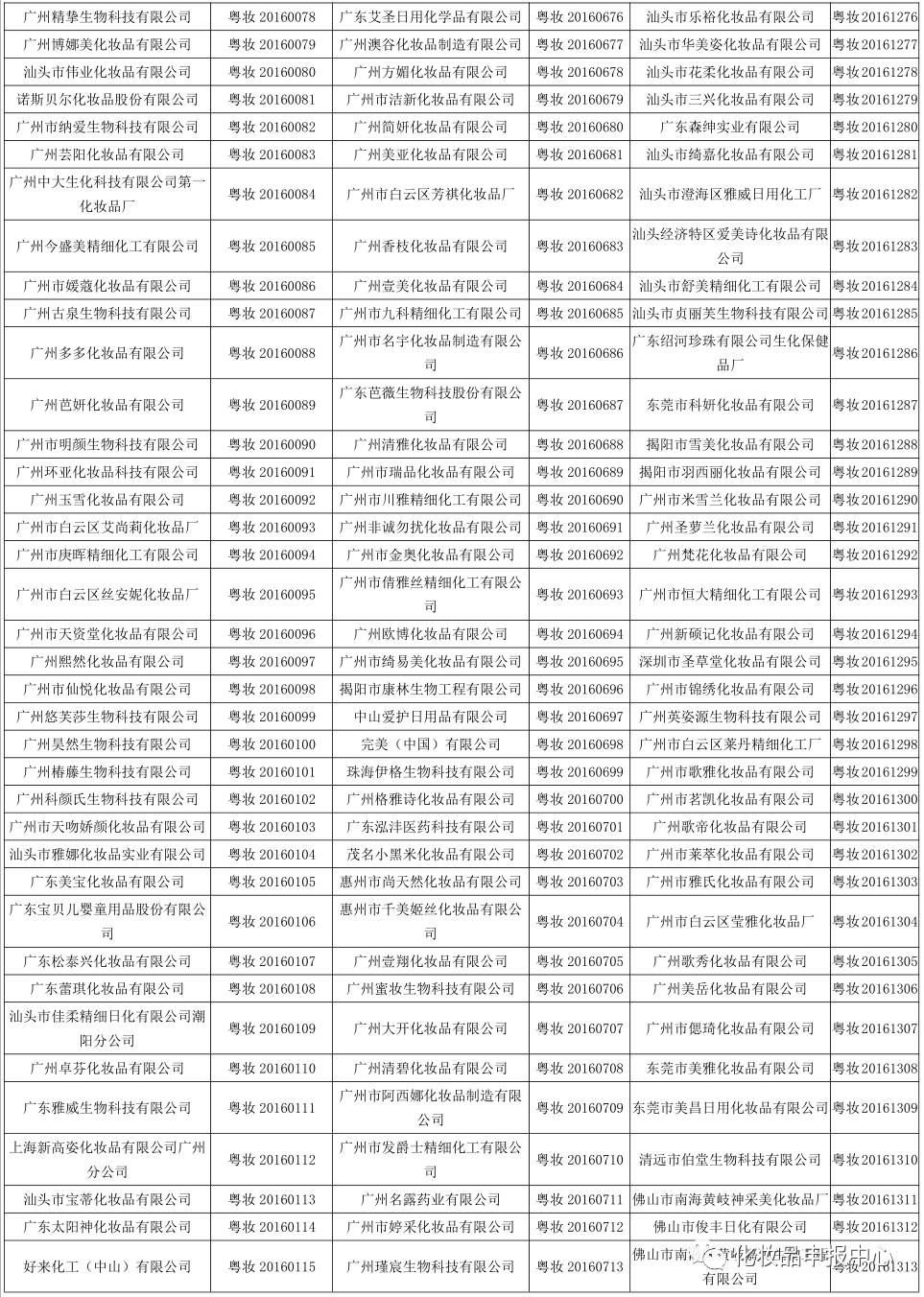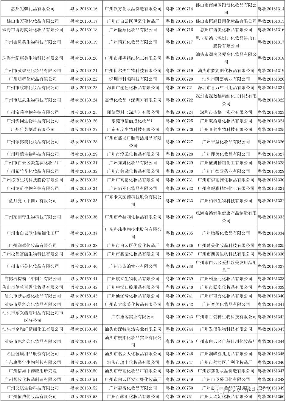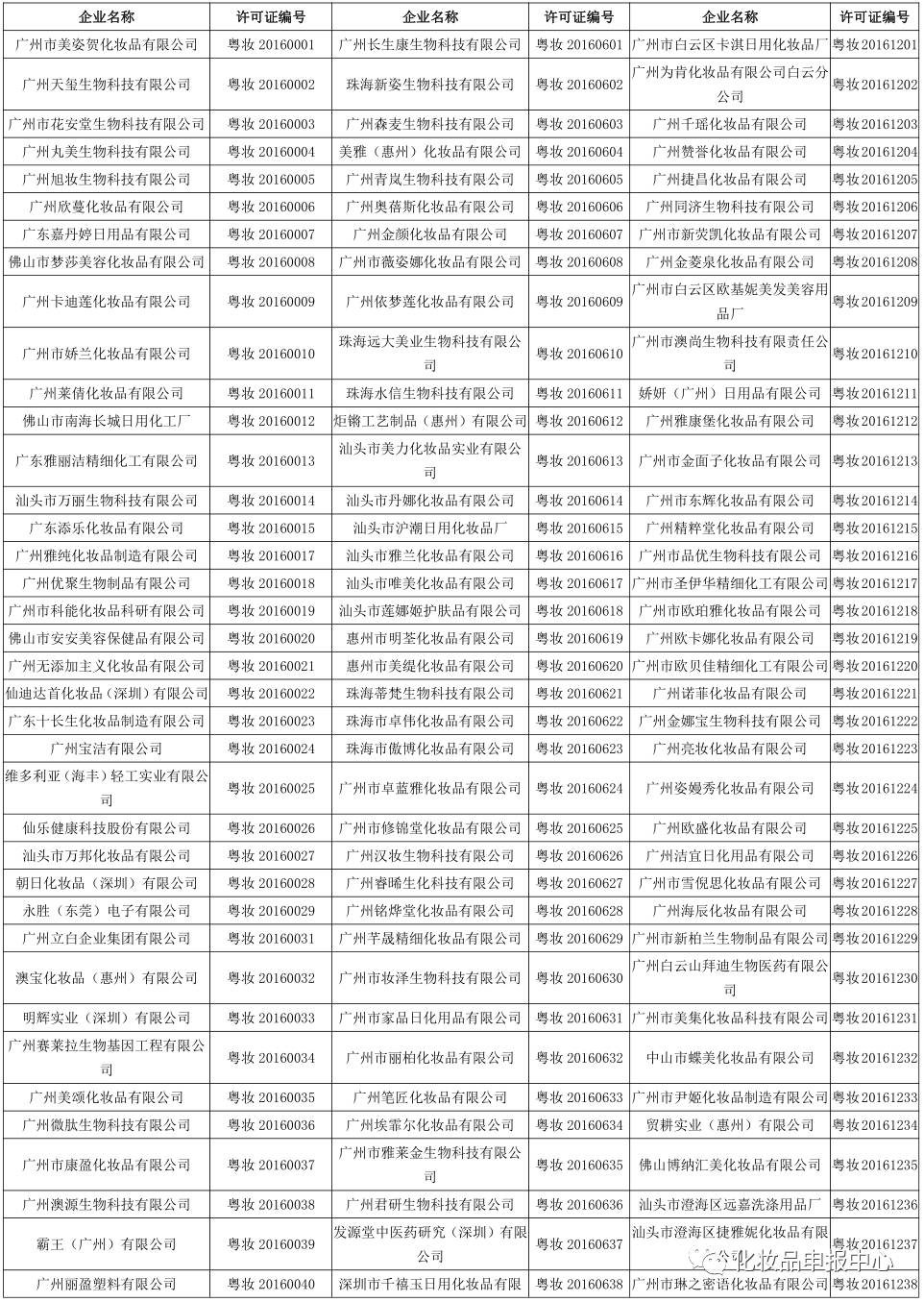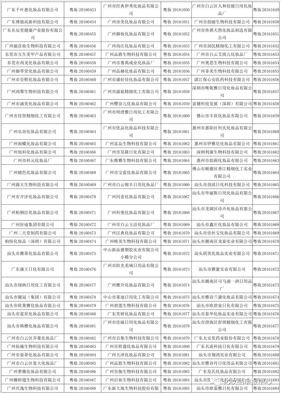 根據(jù)國家食品藥品監(jiān)督管理總局《關(guān)于化妝品生產(chǎn)許可有關(guān)事項(xiàng)的公告》的有關(guān)規(guī)定,2016年1月1日起,廣東省對化妝品生產(chǎn)企業(yè)發(fā)放《化妝品生產(chǎn)許可證》,以下為相關(guān)廠家明細(xì)。