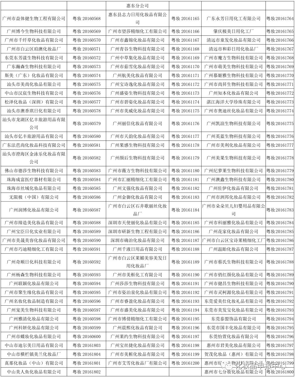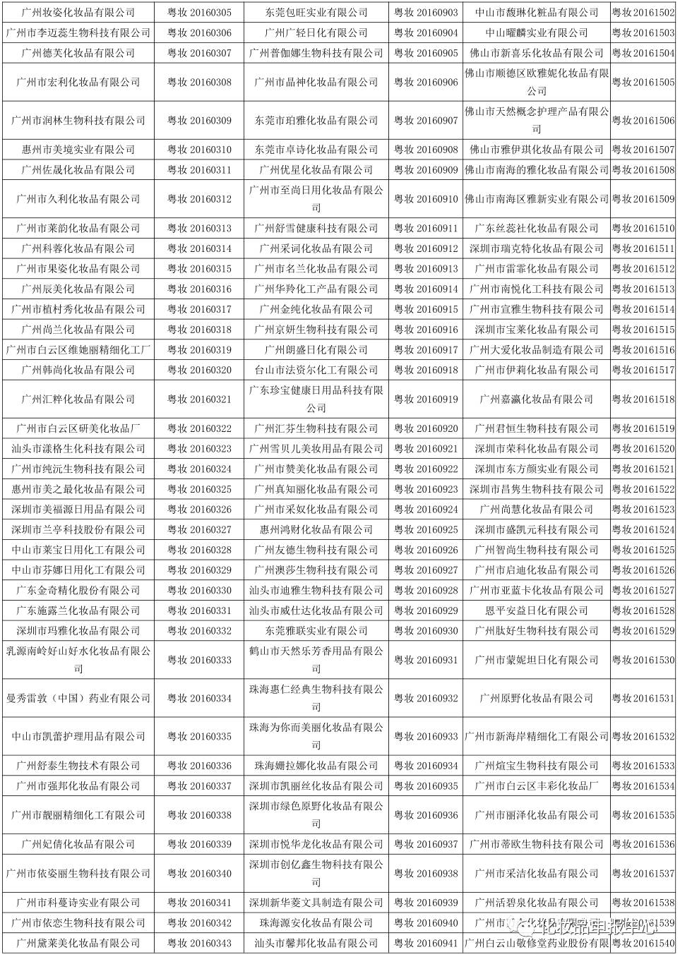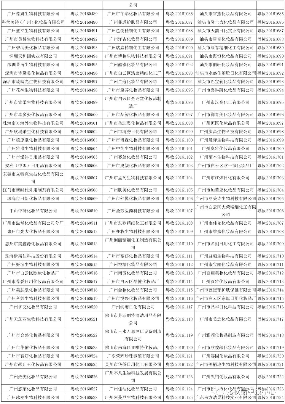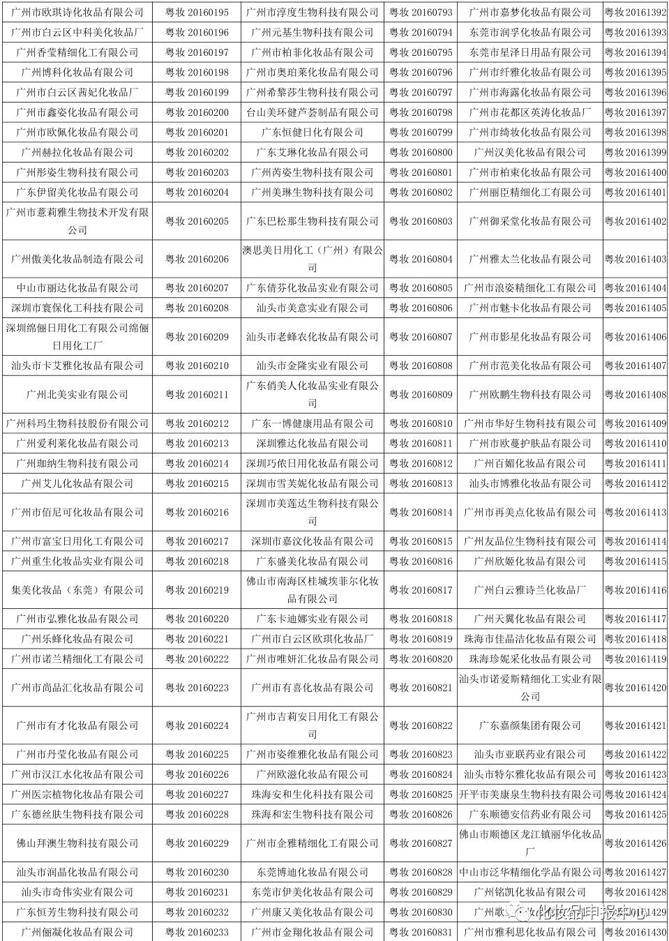 根據(jù)國家食品藥品監(jiān)督管理總局《關(guān)于化妝品生產(chǎn)許可有關(guān)事項(xiàng)的公告》的有關(guān)規(guī)定,2016年1月1日起,廣東省對化妝品生產(chǎn)企業(yè)發(fā)放《化妝品生產(chǎn)許可證》,以下為相關(guān)廠家明細(xì)。
